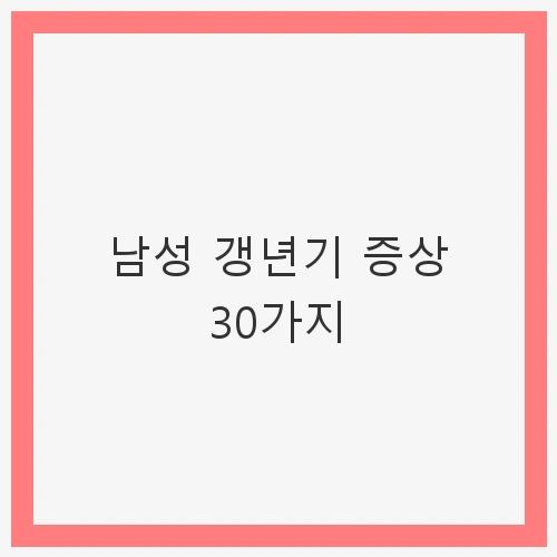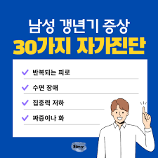 남성 갱년기는 중년 이후에 겪게 되는 생리적 변화로, 다양한 남성 갱년기 증상 30가지가 발생할 수 있습니다. 이 시기는 호르몬 변화와 함께 신체적, 정서적 변화가 동반되며, 이러한 증상은 남성의 삶의 질에 큰 영향을 미칠 수 있습니다. 남성 갱년기 증상은 사람마다 다르게 나타나지만, 여러 가지 일반적인 증상들이 존재합니다. 이 글에서는 남성 갱년기 증상 30가지를 상세히 살펴보겠습니다.